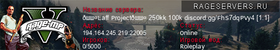 | 1 | 🖤Laff Project🖤 250kk 100k discord.gg/FhS7dqPVy4 [1.1] | 194.164.245.219:22005 | 0/5000 | 0   |