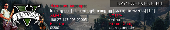 | 1 | training.gg | discord.gg/training-gg [ANTR] [ROMANIA] [1.1] | 188.27.147.206:22005 | 0/300 | 0   |