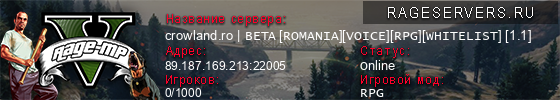 | 1 | crowland.ro | BETA [ROMANIA][VOICE][RPG][WHITELIST] [1.1] | 89.187.169.213:22005 | 0/1000 | 0   |