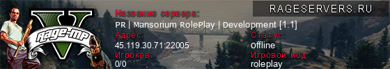 | 1 | PR | Mansorium RolePlay | Development [1.1] | 45.119.30.71:22005 | 0/0 | 0   |