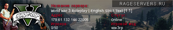 | 1 | World War 3 Roleplay | English Strict Text [1.1] | 179.61.132.144:22005 | 0/50 | 0   |