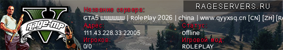 | 1 | GTA5 启元游戏社区 | RolePlay 2026 | china | www.qyyxsq.cn [CN] [ZH] [RolePlay] [1.1] | 111.43.228.33:22005 | 0/0 | 0   |