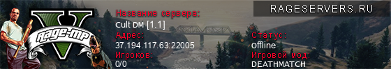 | 1 | Cult DM [1.1] | 37.194.117.63:22005 | 0/400 | 0   |