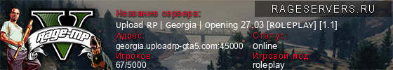 | 1 | Upload RP | Georgia | Opening 27.03 [ROLEPLAY] [1.1] | georgia.uploadrp-gta5.com:45000 | 54/5000 | 0   |