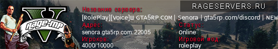 | 1 | [RolePlay][Voice]⭐ GTA5RP.COM | Senora | gta5rp.com/discord | NEW [1.1] | senora.gta5rp.com:22005 | 4716/12000 | 0   |