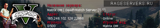 | 1 | Matrix DM | DeathMatch Server [1.1] | 185.248.102.128:22668 | 0/500 | 0   |