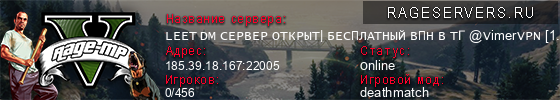| 1 | LEET DM СЕРВЕР ОТКРЫТ| БЕСПЛАТНЫЙ ВПН В ТГ @VimerVPN [1.1] | 185.39.18.167:22005 | 0/456 | 0   |