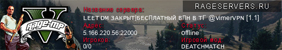 | 1 | LEET DM ЗАКРЫТ|БЕСПЛАТНЫЙ ВПН В ТГ @VimerVPN [1.1] | 5.166.220.56:22000 | 0/0 | 0   |