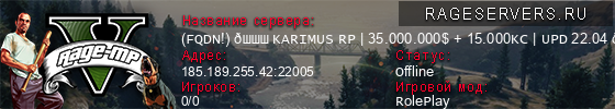 | 1 | (FQDN!) 👑 KARIMUS RP | 35.000.000$ + 15.000KC | UPD 22.04 👑[BONUS] [1.1] | 185.189.255.42:22005 | 0/0 | 0   |