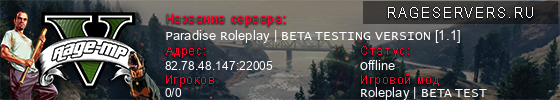 | 1 | Paradise Roleplay | BETA TESTING VERSION [1.1] | 82.78.48.147:22005 | 0/5000 | 0   |