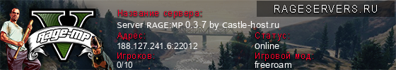 | 1 | Server RAGE:MP 0.3.7 by Castle-host.ru | 188.127.241.6:22012 | 0/10 | 0   |