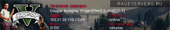 | 1 | Cougar Roleplay Project[Test] [Lokal] [1.1] | 103.31.39.159:22005 | 0/100 | 0   |
