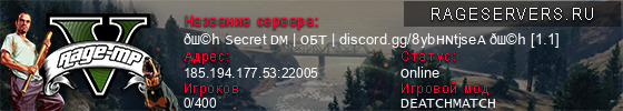 | 1 | 🩶 Secret DM | ОБТ | discord.gg/8ybHNtjseA 🩶 [1.1] | 185.194.177.53:22005 | 0/400 | 0   |