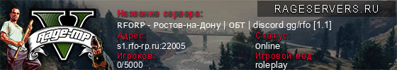| 1 | RFORP - Ростов-на-Дону | ОБТ | discord.gg/rfo [1.1] | s1.rfo-rp.ru:22005 | 0/5000 | 0   |