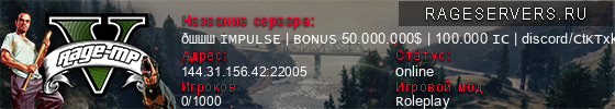 | 1 | 🌎 IMPULSE | BONUS 50.000.000$ | 100.000 IC | discord/CtKTxkMrmE [1.1] | 144.31.156.42:22005 | 0/1000 | 0   |