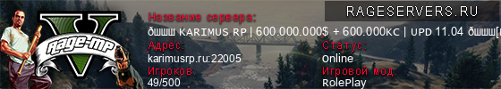 | 1 | 💙 KARIMUS RP | 600.000.000$ + 600.000KC | UPD 11.04 💙[BONUS] [1.1] | karimusrp.ru:22005 | 57/500 | VIP |